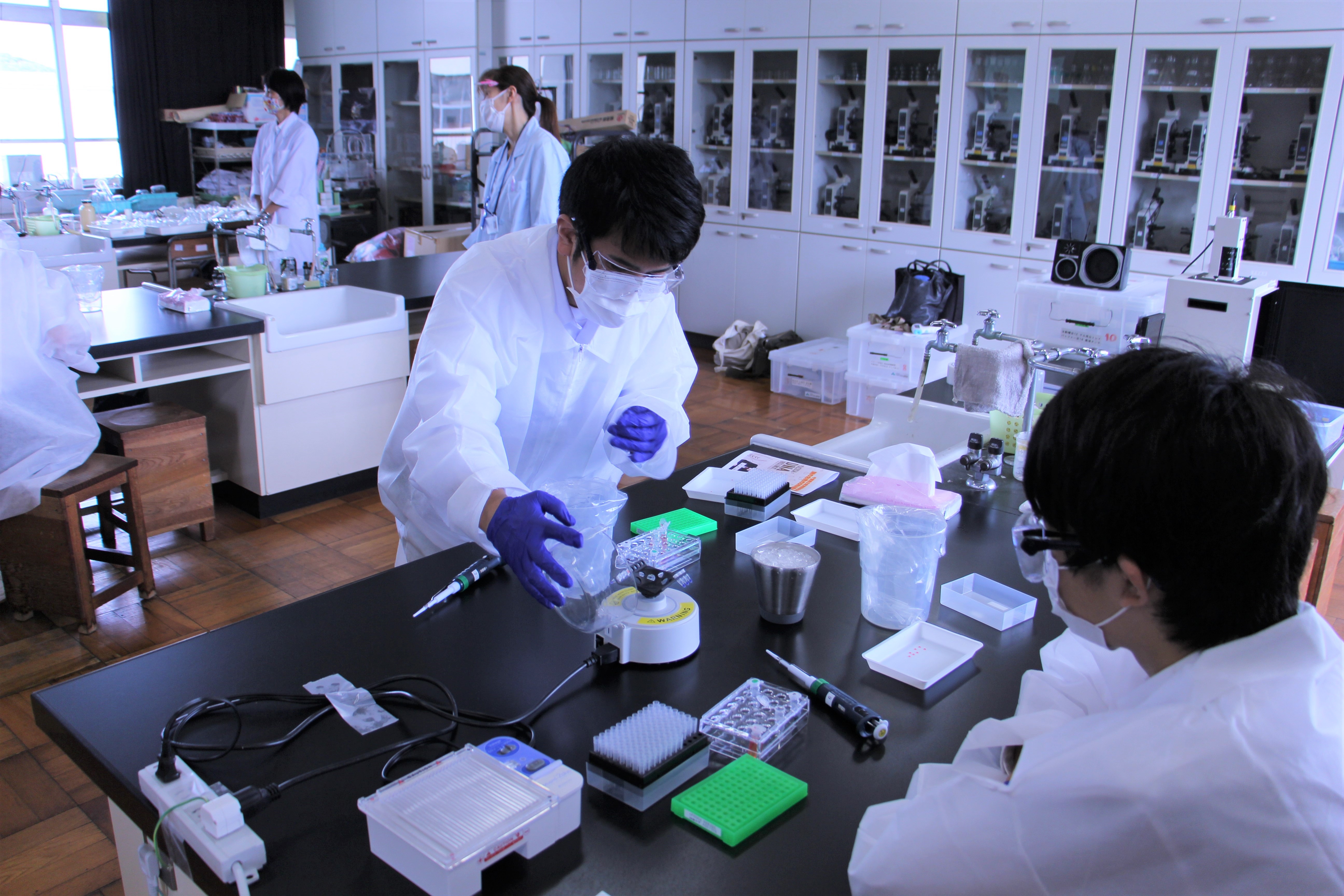 微量な液体を扱うマイクピペットや遠心機、電気泳動装置といった専門的な機器を扱いながら、DNAの研究に欠かせないPCR法やアガロースゲル電気泳動など分子生物学的な手法で、各自に配られた謎の食肉(ブタ、トリ、ウシ)のDNA鑑定を行いました。 |